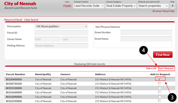 2. Once you select all the parcels you want changed, click “Start Request”.