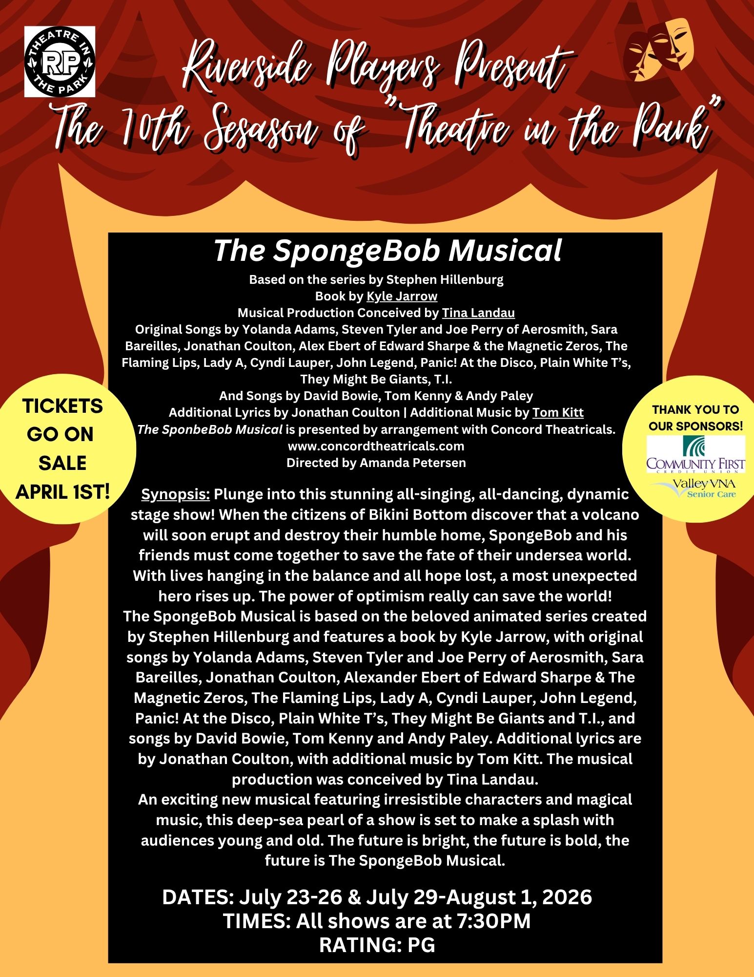 | Times: | All shows of The SpongeBob Musical will be at 7:30PM. All shows of Rumors will be at 7:00PM |