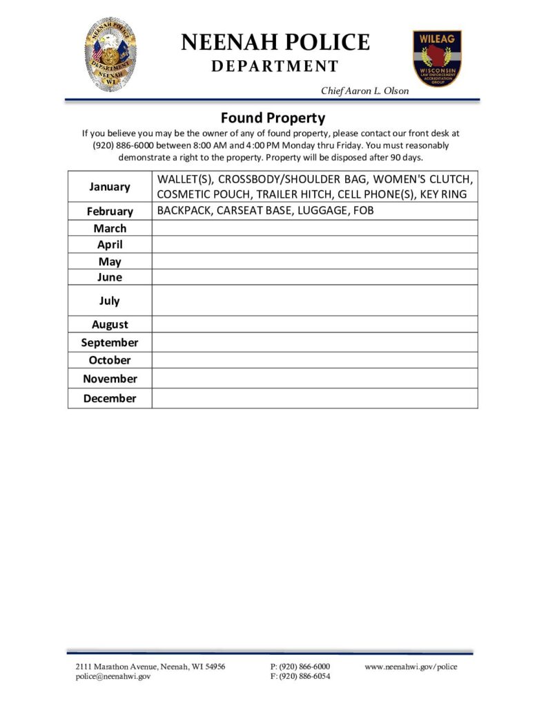 We keep a list of all Found Property on a list. The list can be viewed below (updated 2/11/26):